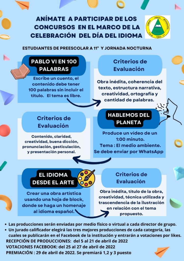 Con motivo de la celebración del día del idioma del año 2022, se diseñó la estrategia de explorar los talentos de los estudiantes en escritura, oralidad y dibujo. De esta manera se extiende la posibilidad de expresión comunicativa, se incluyen a todos los estudiantes desde sus intereses y se premiaban las mejores producciones a través de las redes sociales institucionales, con el fin de involucrar a toda la comunidad en votaciones y compartir las habilidades de los estudiantes.