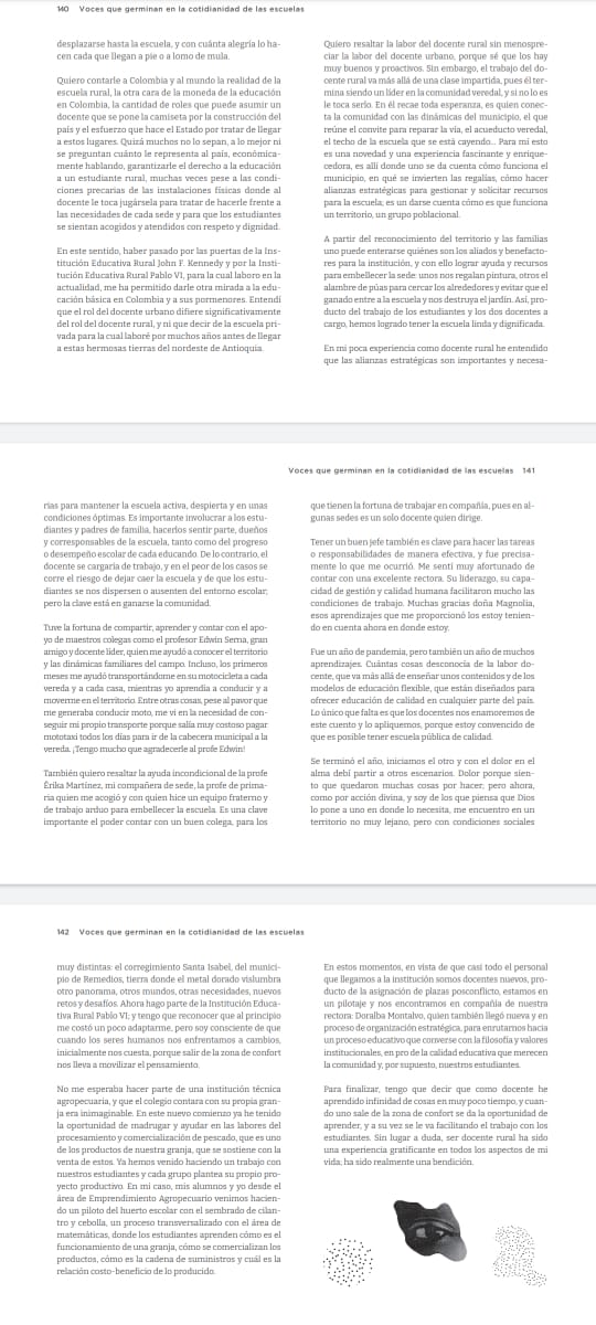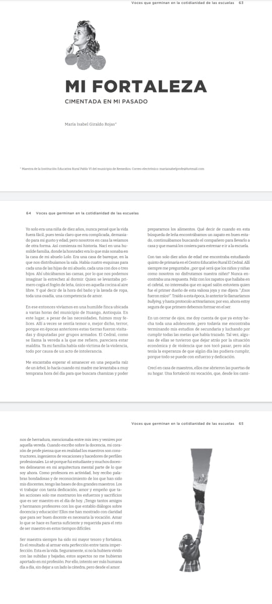 Los relatos que se publican a continuación están cargados de anécdotas personales permeadas por el conflicto armado colombiano, pero también de esperanza y el aporte del rol del docente en la comunidad de Santa Isabel.