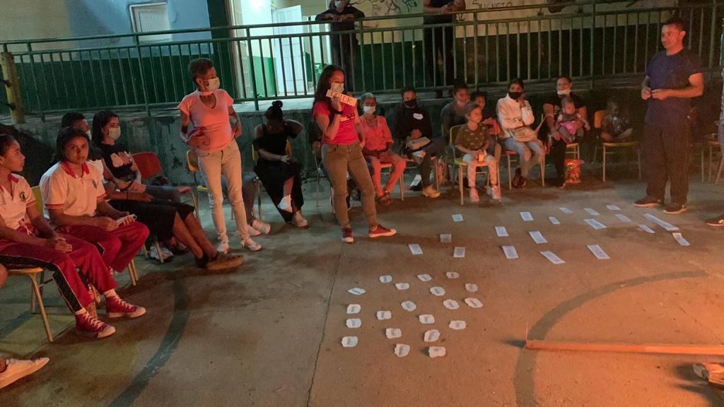 La docente Edilia motivando a los estudiantes adultos con un sentido compartir para celebrar los valores del amor y la amistad, a su vez que se fortalecen los lazos de compañerismo entre los diferentes CLEI.